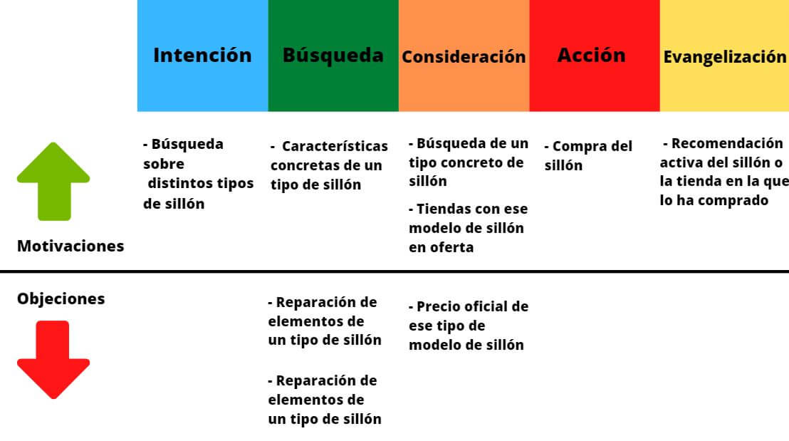 En esta imagen, por el contrario, puedes ver el customer Journey que plasma el proceso de compra de un sillón, también con algunas objeciones y motivaciones.