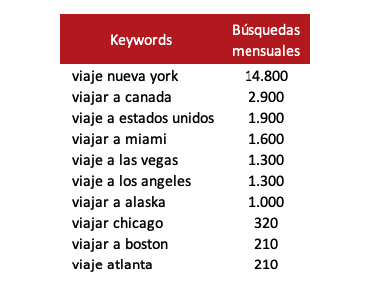 - Nombre destino: se trata de keywords con mucho volumen, pero muy genérica. El usuario/a puede estar buscando información sobre el país para viajar o por cualquier otro motivo: por trabajo, por información geográfica, estudios, etc.